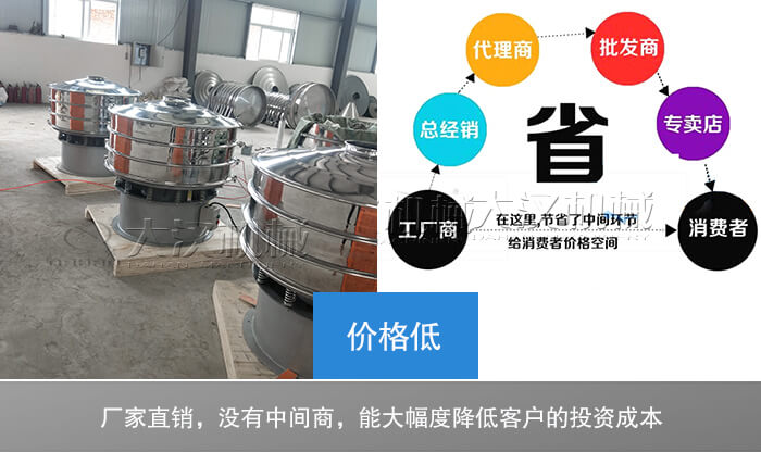 大漢化工振動(dòng)篩價(jià)格是目前市場(chǎng)上同行業(yè)內(nèi)比較低的,原因就在于我們采取的是薄利多銷營銷策略,制定的設(shè)備價(jià)格市場(chǎng)價(jià)和出廠價(jià)是相同的,廠家直銷,沒有中間商,能大幅度降低客戶的投資成本。