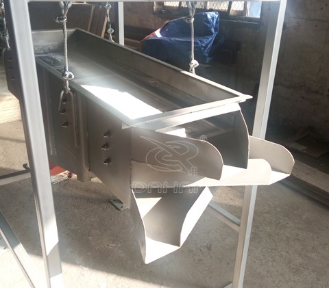 吊掛式直線篩物料從給料機(jī)均勻地進(jìn)入篩分機(jī)的進(jìn)料口,在振動(dòng)電機(jī)的激振下,向出料口方向邊跳動(dòng)邊篩分。