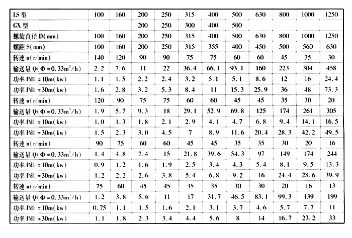 LS型、GX型螺旋輸送機(jī)主要技術(shù)參數(shù)