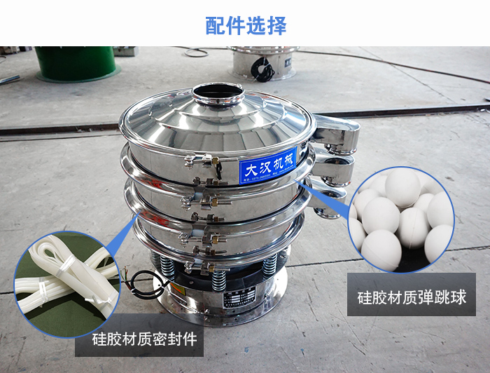 為了配合不銹鋼旋振篩篩分的潔凈性,要求不銹鋼旋振篩的相關(guān)配件也需要達(dá)到一定的標(biāo)準(zhǔn),其清網(wǎng)裝置-彈跳球和密封裝置-密封件要采用食品硅膠材質(zhì),以防止對物料造成一定的污染性。