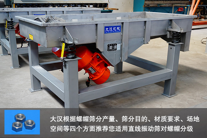 大漢根據(jù)螺帽篩分產(chǎn)量、篩分目的、材質(zhì)要求、場地空間等四個方面推薦您適用直線振動篩對螺帽分級。