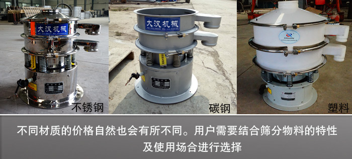 DH-400旋振篩DH-400旋振篩材質(zhì)有碳鋼、不銹鋼、塑料等3種,不同材質(zhì)之間會存在原材料采購費用的不同,所以不同材質(zhì)的價格自然也會有所不同。用戶需要結合篩分物料的特性及使用場合進行選擇。